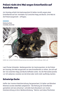 Unser Einsatz vom 3.6.2018 auf der Autobahn A13 rettete 5 Entenküken das Leben.